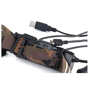 500 lumens in ‘boost’ mode Adjustable brightness (High-350, Medium-150, Low-25 lumens) Bulb type: 1 x XP-G2 Cree White LED Light unit made from a hardwearing anodised aluminium USB Rechargeable Li-ion battery supplied Also supplied with Micro USB charging cable Single elasticated, adjustable camo head band Battery is positioned at rear in separate case (38mm x 102mm x 35mm), which also features single button operation red light Side operation button for front light Charging status indicator on rear: Red light indicates charging, green light indicates fully charged Weight including battery 190g Important Note: Re-charge battery every 3 months if not being used for a long time. The battery will only reach full performance after a few complete charging and discharging cycles.