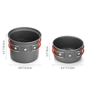 ✅【Incredibly Durable】: Made of non-toxic anodized aluminum. Each non stick camping pot is solid and lightweight. It conducts heat quickly and is a great cookware set for use long time.